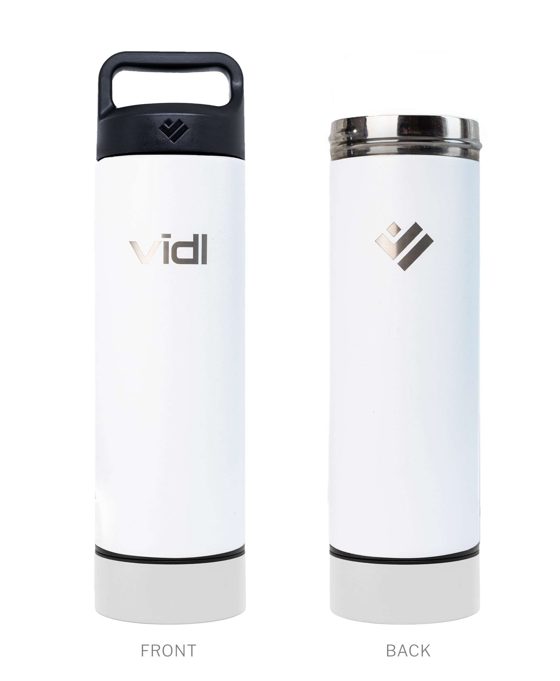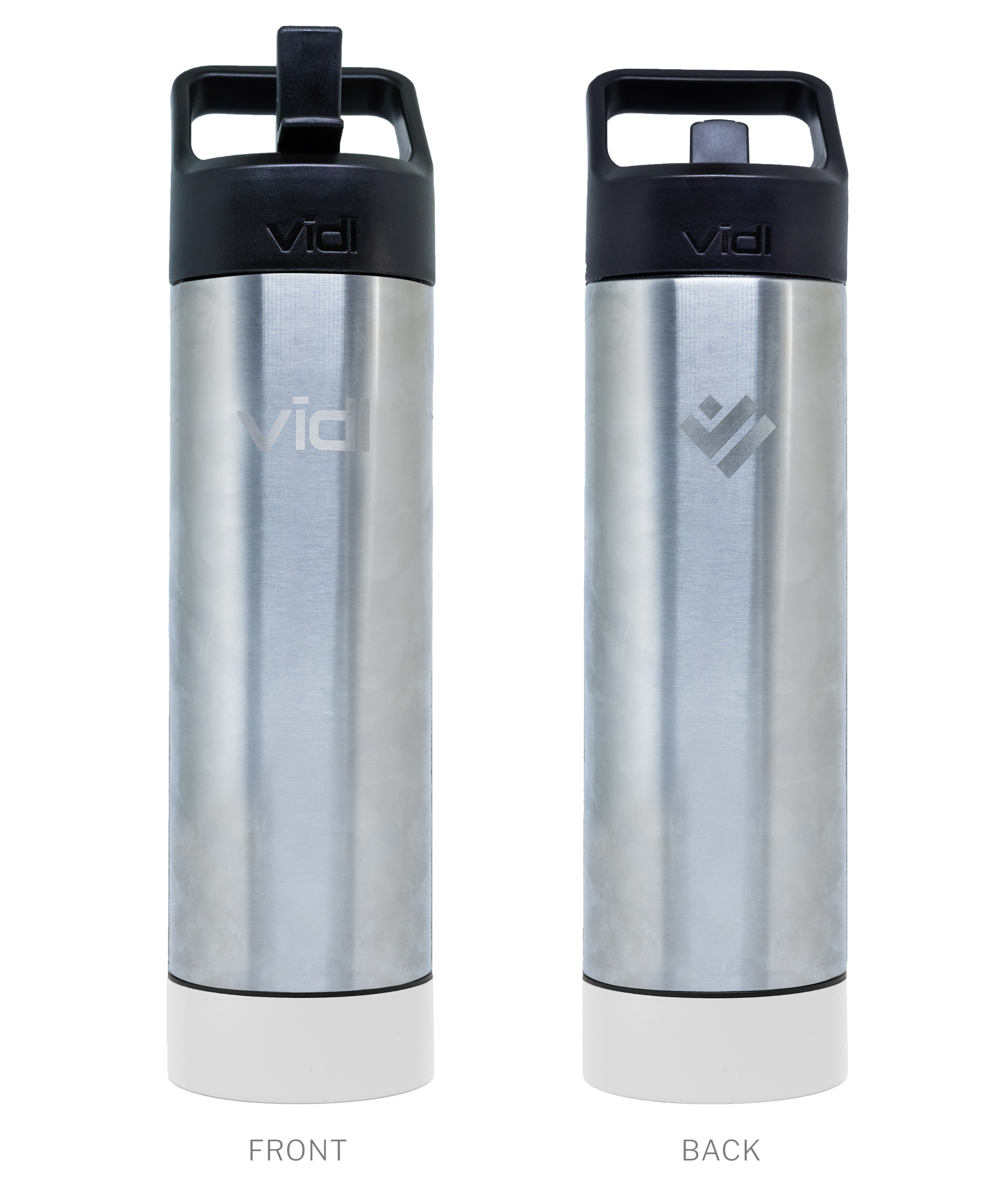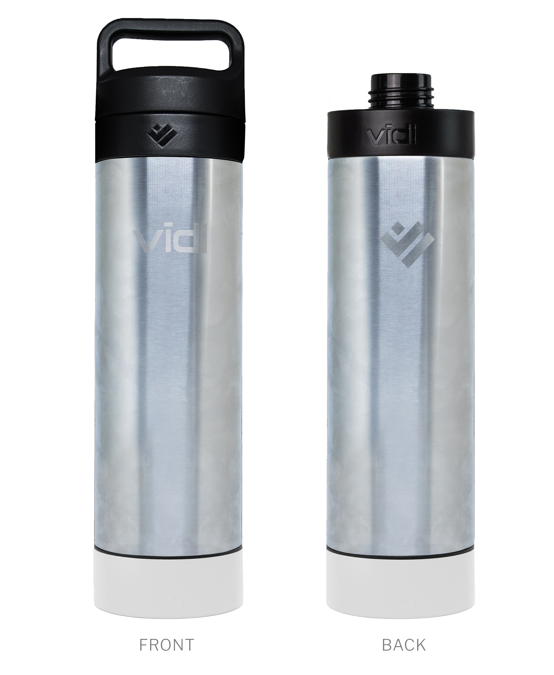20 oz, double-wall, vacuum-insulated stainless steel bottle with a twist-off, sealed storage compartment.
