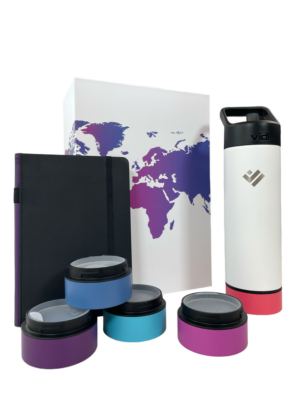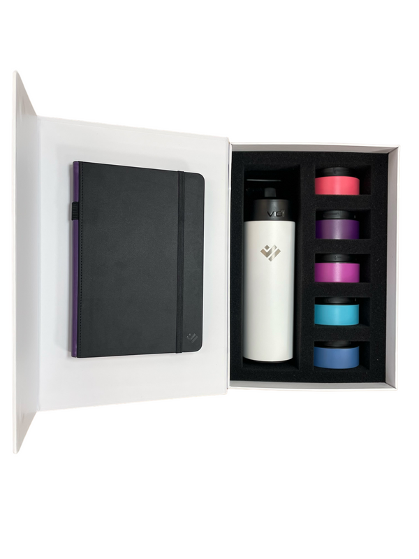 It comes with 1 bottle, 1 lid, 5 bases, and 1 journal, all in a designer box.