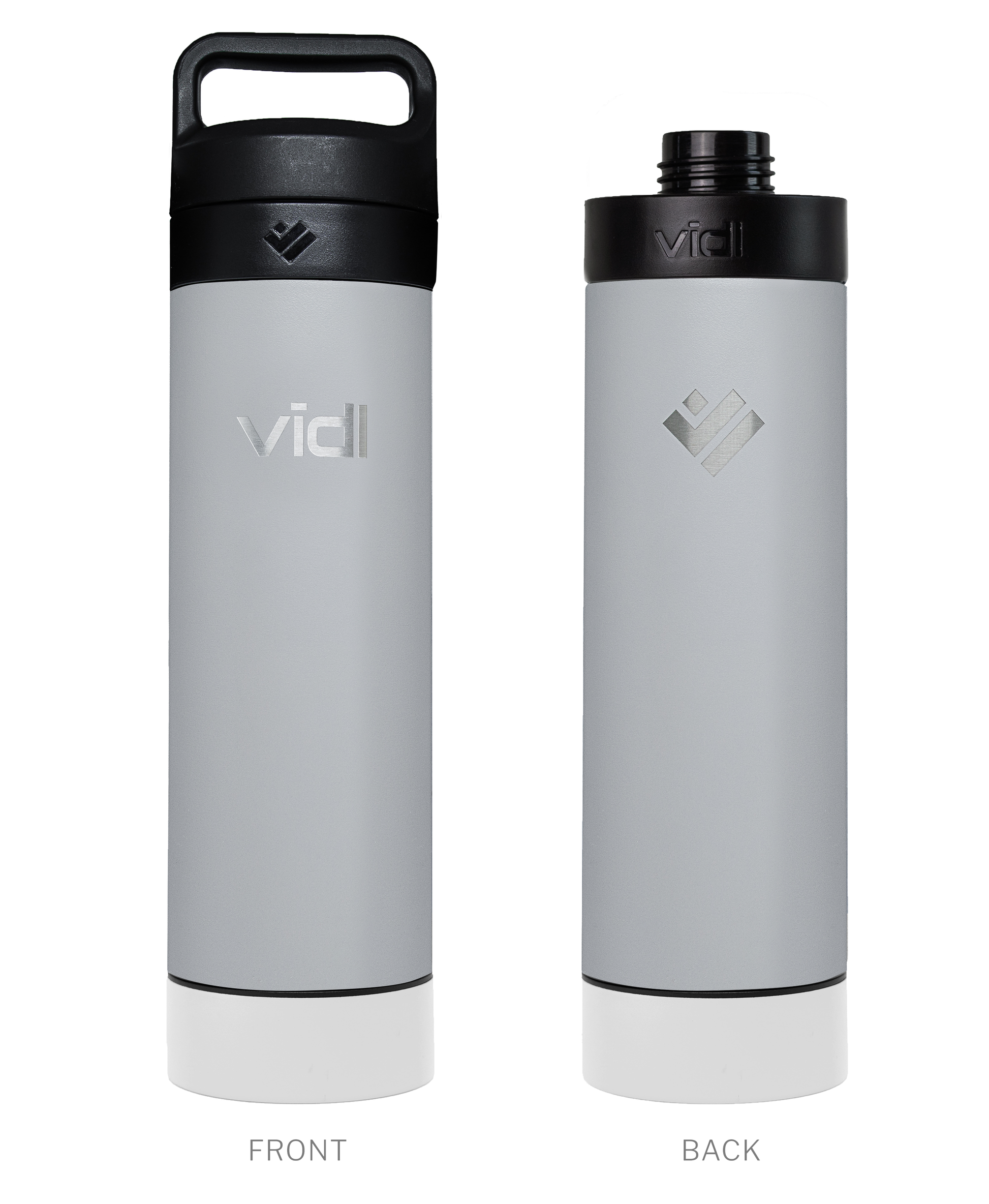 20 oz, double-wall, vacuum-insulated stainless steel bottle with a twist-off, sealed storage compartment.