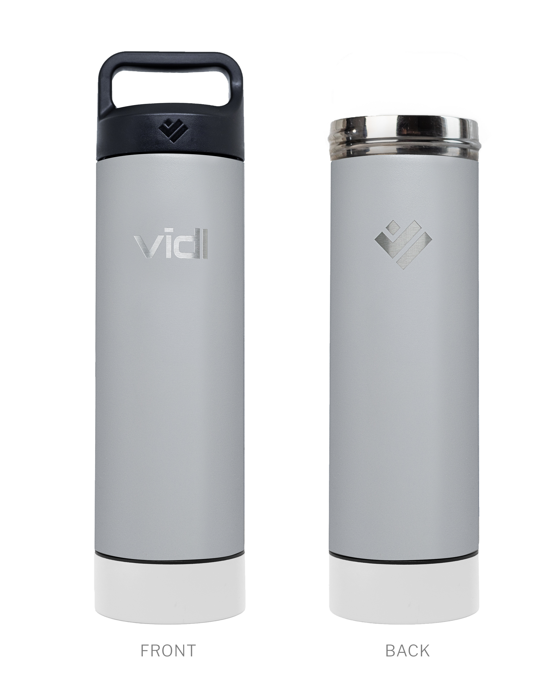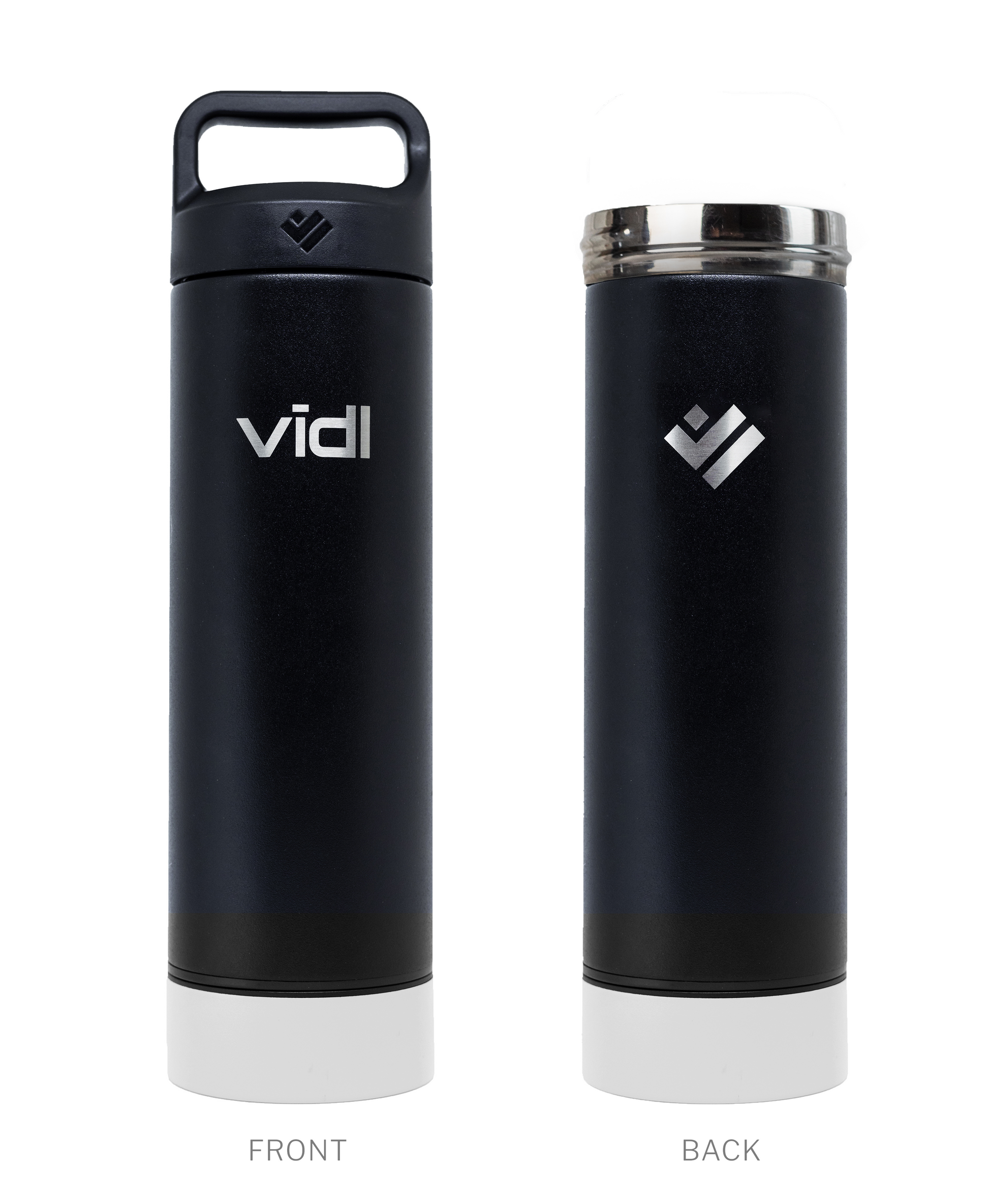 20 oz, double-wall, vacuum-insulated stainless steel bottle with a twist-off, sealed storage compartment.