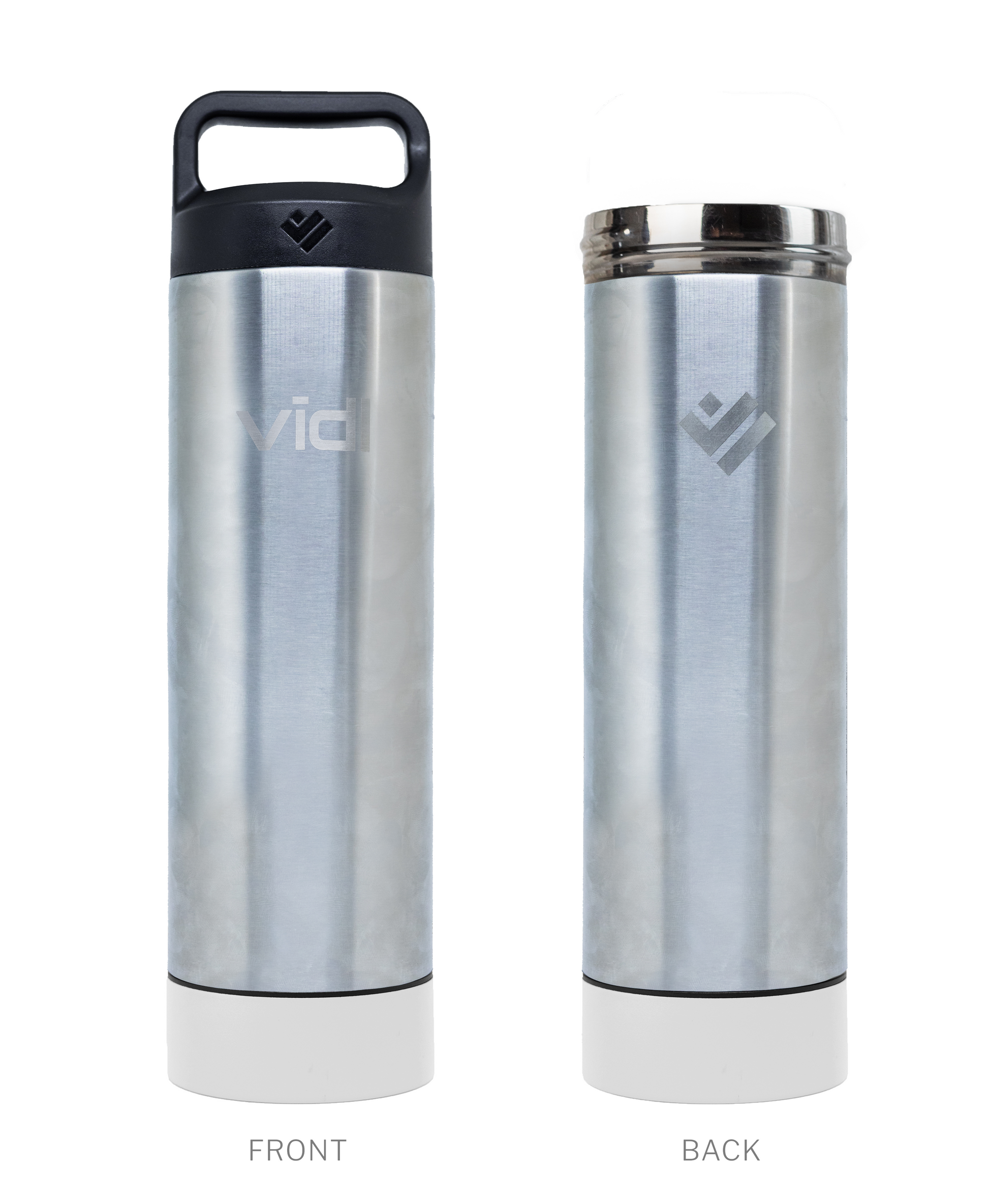 20 oz, double-wall, vacuum-insulated stainless steel bottle with a twist-off, sealed storage compartment.